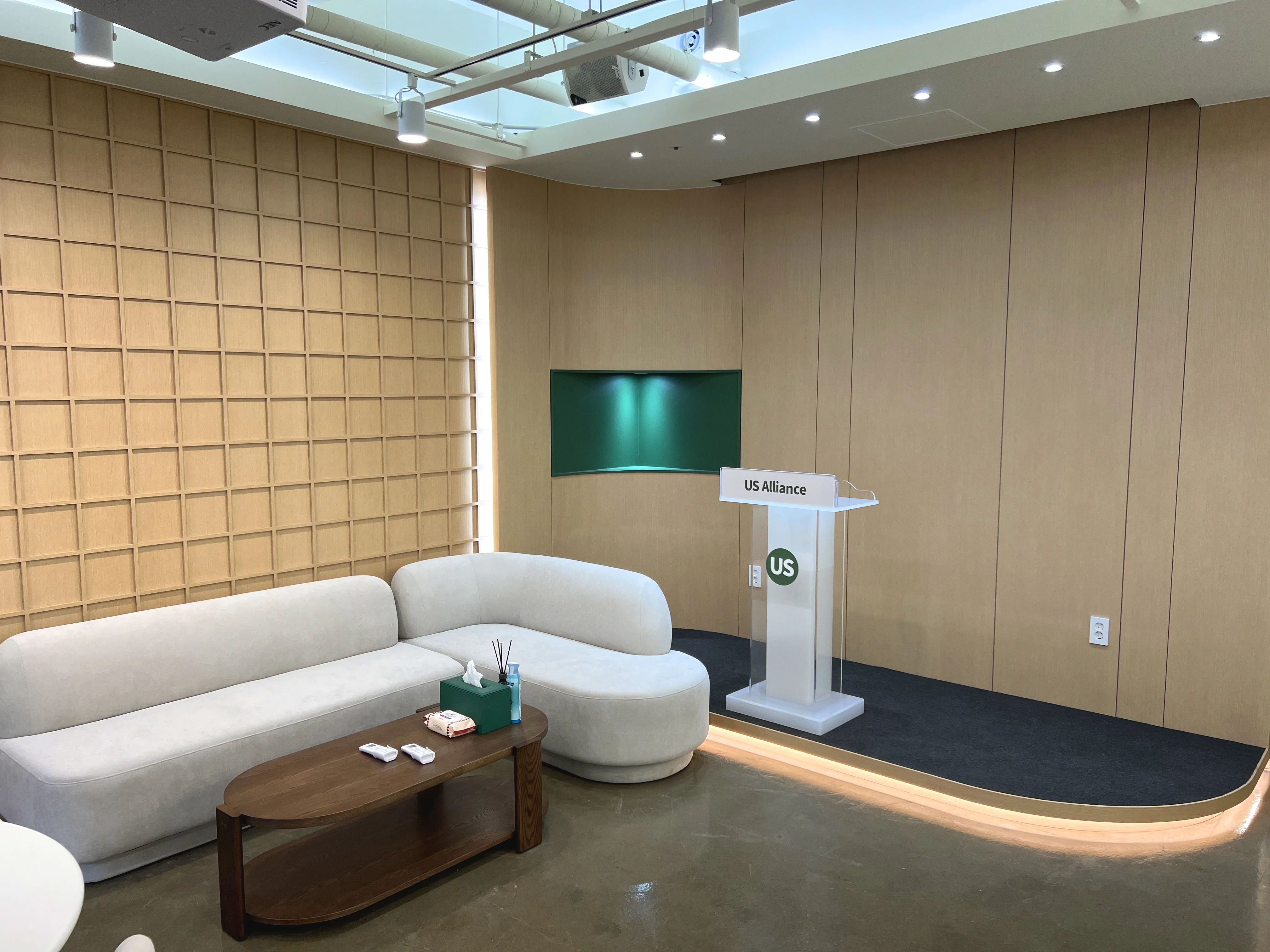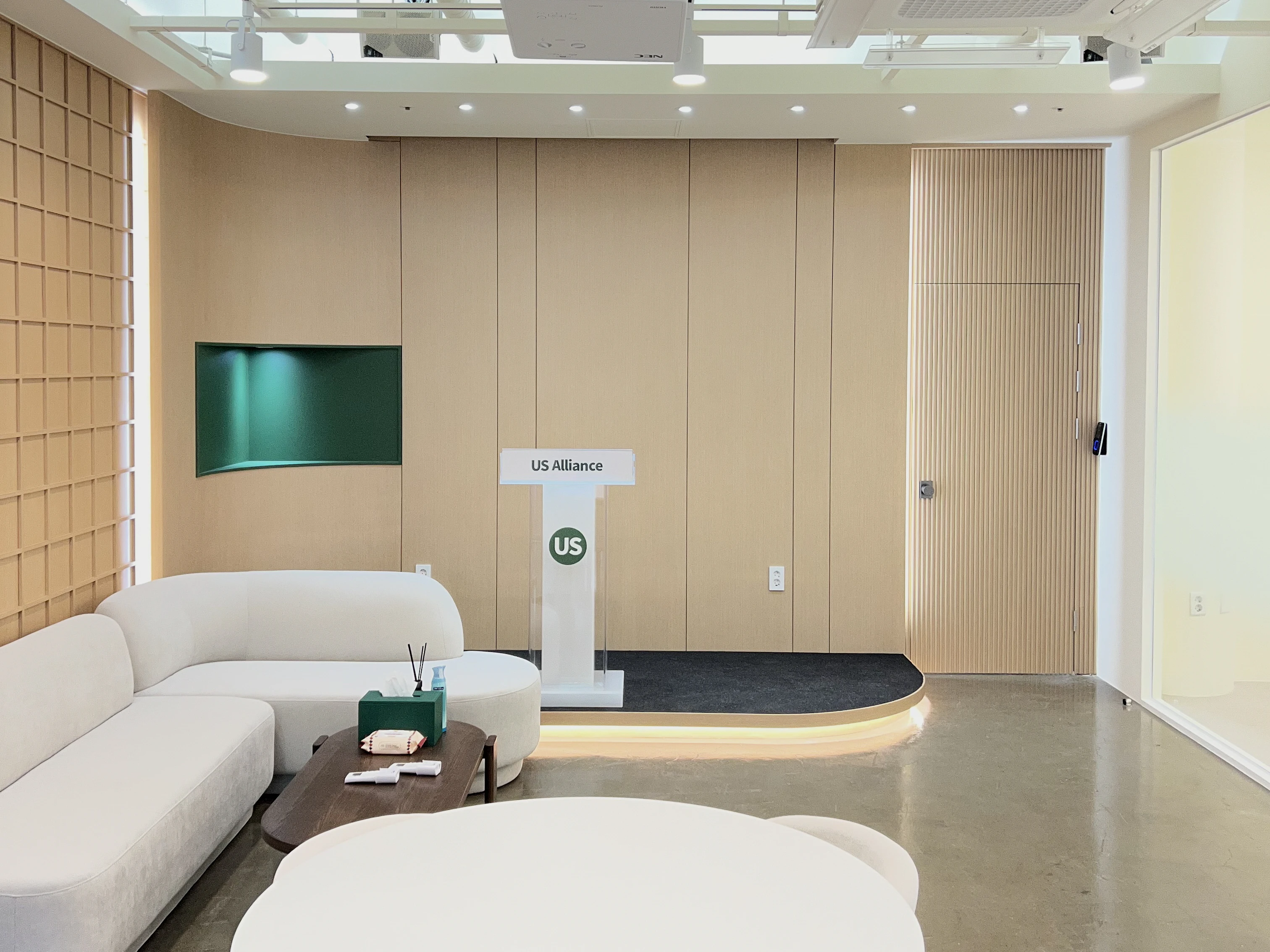 신뢰·정확·소통의 철학을 담은 상징적 공간.기능: 미팅·회의·촬영·휴식·기록관리 등 복합형 브랜드 존.
